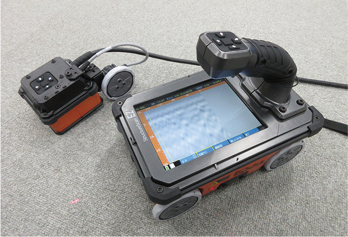 電磁波をコンクリート内部に放射し、対象物からの反射波を捉えて、コンクリート中の鋼材や鉄筋位置等を判別する非破壊での探査方法です。エックス線透過撮影法による探査が出来ない厚い梁や柱などを電磁波レーダで探査する事で、鉄筋の有無や深度、配筋状況を迅速に調べる事ができます。